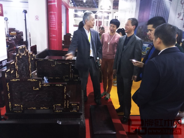 中國紅木家具文化研究院院長、著名明式家具學(xué)者濮安國(左一)在精品評(píng)選區(qū)點(diǎn)評(píng)翰博古典家具力作