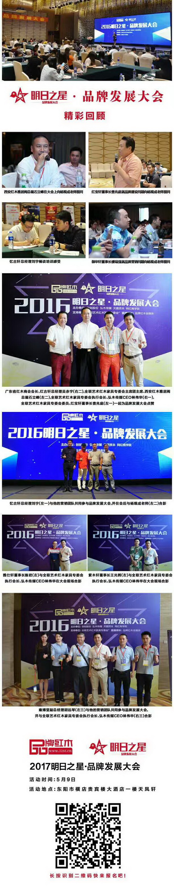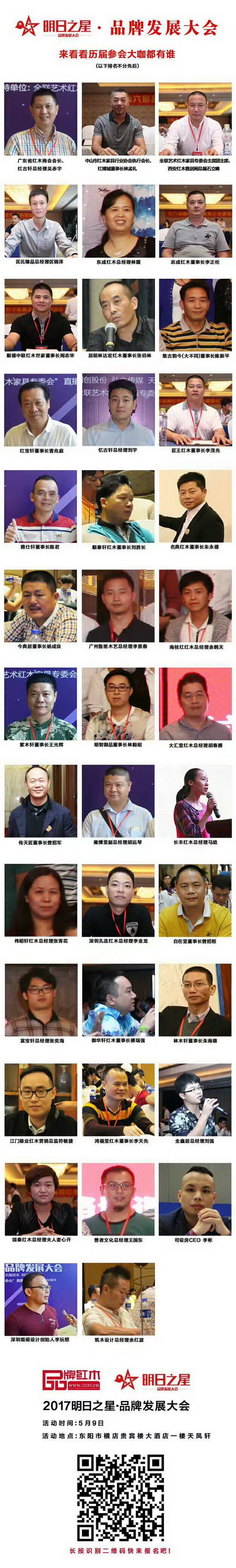 2017年紅木行業(yè)唯一一期品牌實戰(zhàn)課程——“2017明日之星·品牌發(fā)展大會”,將于5月9日在橫店貴賓樓大酒店一樓天鳳軒隆重舉行。屆時,楊六老師將為東陽紅木家具企業(yè)老板揭曉品牌策劃核心價值的謎底。
