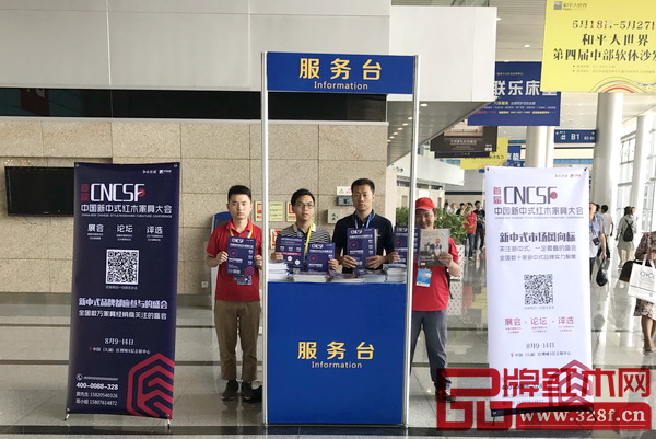 在武漢家具展現(xiàn)場,首屆中國新中式紅木家具大會的宣傳推廣隨處可見