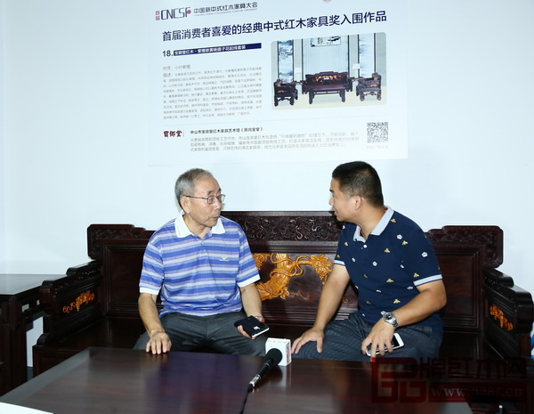 中國紅木家具技術(shù)專家曹新民(左)對寶御堂紅木作品進行點評,并與其總經(jīng)理李巧新(右)交流