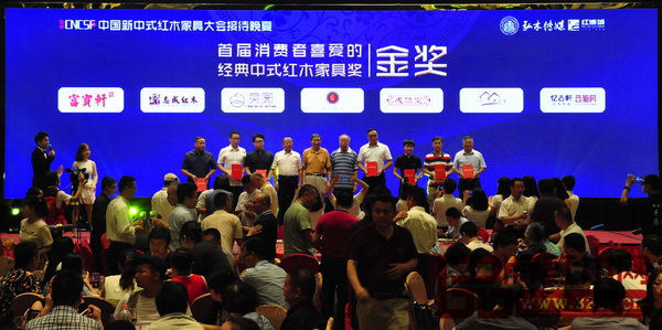 原故宮博物院文??萍疾恐魅尾莒o樓(左五)、故宮博物院研究員周京南(左四)、中國紅木家具技術(shù)專家曹新民(右五)為“首屆消費者喜愛的經(jīng)典中式紅木家具獎”金獎獲獎?wù)咧境杉t木(右一)頒發(fā)證書