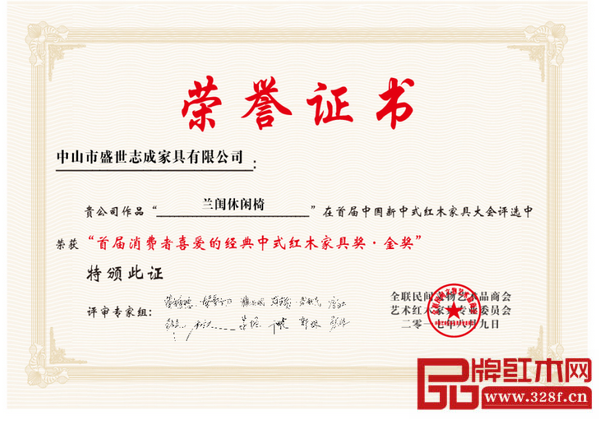 志成紅木《耕梨·蘭閨休閑椅》榮獲“首屆消費(fèi)者喜愛(ài)的經(jīng)典中式紅木家具獎(jiǎng)”金獎(jiǎng)證書(shū)