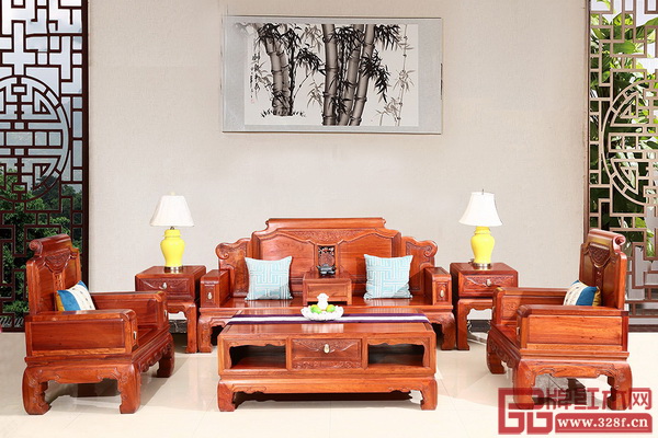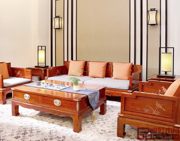 簡潔明了的線條和栩栩如生的鳥戲卷草的圖案,結(jié)合宮廷御用的絲翎檀雕技藝,讓整套梳化展現(xiàn)出大氣和雅致的中式韻味。
