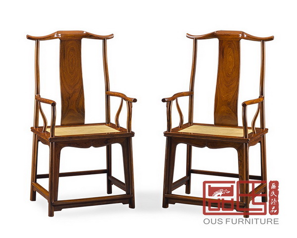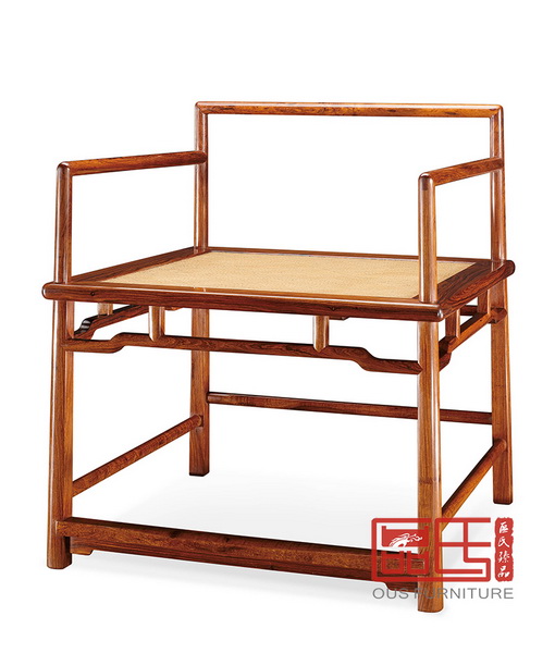 此椅扶手、搭腦均以圓材架構(gòu),不設(shè)靠背椅、聯(lián)幫棍,通透空靈。座面席面硬屜,尤為寬闊,便于參禪打坐。面下用材皆削成外圓內(nèi)方。正面及兩側(cè)皆設(shè)羅鍋棖,上樹雙矮老。四腿間以步步高趕棖相聯(lián),正面棖子下加施素牙條。