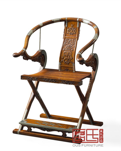 此交椅圓后背式,椅圈末端外撇出頭,塑性流暢??勘硵€邊裝獨板,以兩抹分三段:上雕如意云頭紋,中雕雙螭捧壽紋,螭龍上下俯仰,捧定三足鼎壽字形,寓征祥瑞。座面以木條編連,櫛比可折疊,其橫材立面浮雕螭龍,龍身相向,捧和中間卷草。兩足間聯(lián)以貼地橫材,上置踏床,床面包銅,并以鐵帽釘固定,做成古錢紋。此椅風格清俊,各處加固銅件均做平鑲,與材面平齊,做工考究。