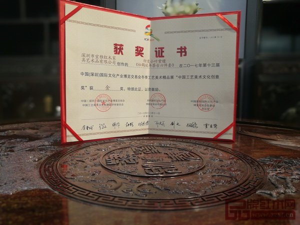 12月11日,歷時四天的2017第十三屆中國(深圳)文化產(chǎn)業(yè)博覽交易會冬季工藝美術(shù)精品展(以下簡稱深圳文博會)圓滿落幕,同期,中國工藝美術(shù)文化創(chuàng)意獎評選結(jié)果揭曉并舉行頒獎典禮,深圳市宜雅紅木家具藝術(shù)品有限公司(以下簡稱泰和園)經(jīng)典藝術(shù)紅木家具《松鶴延年茶臺六件套》不負眾望,摘得“中國工藝美術(shù)文化創(chuàng)意獎”金獎。
