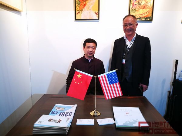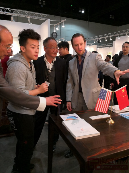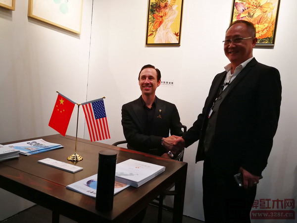 洛杉磯藝博會董事局主席斯科特(左)參觀紅木家具展區(qū),與魯班木藝李愛金大師(右)交流