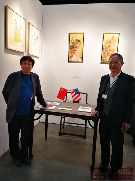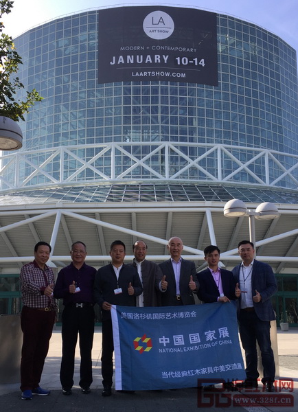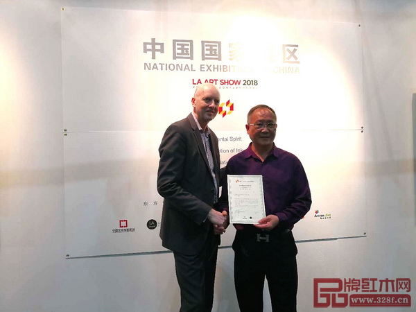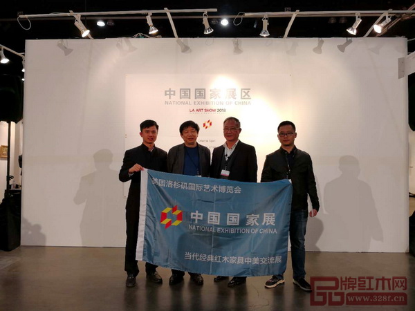 中國傳統(tǒng)工藝大師、魯班木藝董事長(左二)受邀參加第23屆美國洛杉磯藝術(shù)博覽會中國國家展,為中國紅木代言