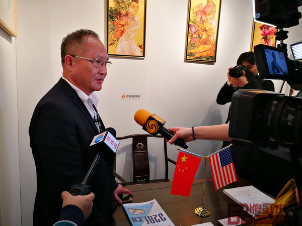 李愛金大師在展會現(xiàn)場作品區(qū)接受美國國家電視臺采訪