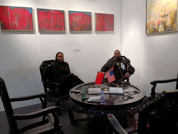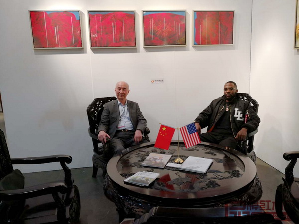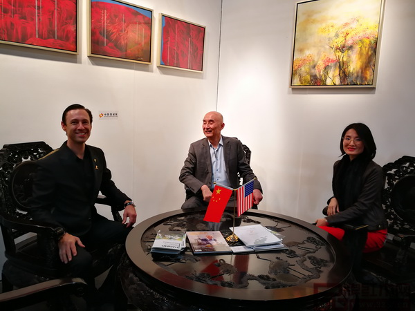 美國(guó)藝術(shù)名流對(duì)泰和園邵湘文大師巨作十分贊嘆,并與泰和園總經(jīng)理邵潔理(左)進(jìn)行了深入交流