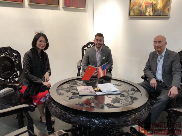 洛杉磯藝博會(huì)董事局主席斯科特(左)參觀紅木家具展區(qū),與泰和園邵湘文大師(中)、泰和園總經(jīng)理邵潔理(右)交流并合影留念