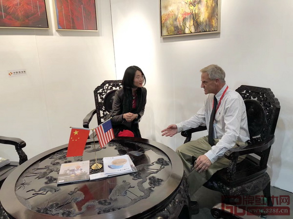 泰和園總經(jīng)理邵潔理在展會(huì)現(xiàn)場(chǎng)接受美國(guó)國(guó)家電視臺(tái)采訪