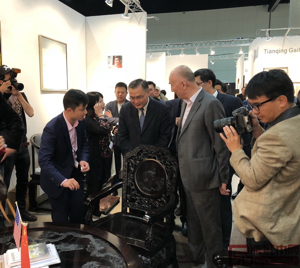 中國(guó)駐洛杉磯總領(lǐng)館總領(lǐng)事張平(中)在全聯(lián)藝術(shù)紅木家具專委會(huì)執(zhí)行會(huì)長(zhǎng)林偉華(左)的陪同下,參觀紅木家具展區(qū),并與泰和園邵湘文大師(右二)交流