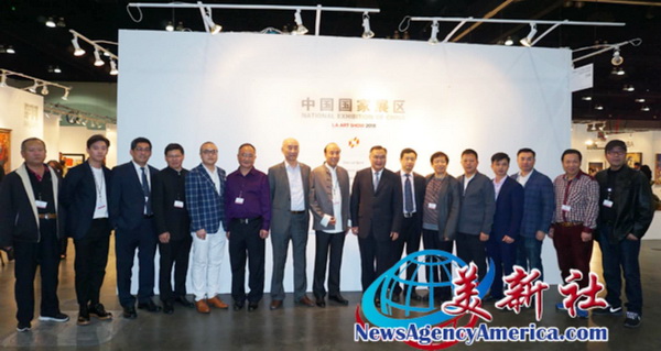 中國(guó)傳統(tǒng)工藝大師、泰和園邵湘文(左七)受邀參加第23屆美國(guó)洛杉磯藝術(shù)博覽會(huì)中國(guó)國(guó)家展,并與中國(guó)駐洛杉磯總領(lǐng)館總領(lǐng)事張平(中右)、文化參贊古今(中右一)及全國(guó)工商聯(lián)第十一屆執(zhí)委宋建文(右六),以及其他大師代表合影