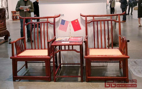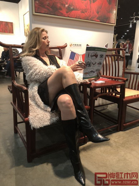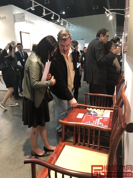 洛杉磯藝博會(huì)開幕式現(xiàn)場,外國友人與國壽紅木副總經(jīng)理王耀佳(右)坐于《宋韻四出頭梳背椅》上合影留念