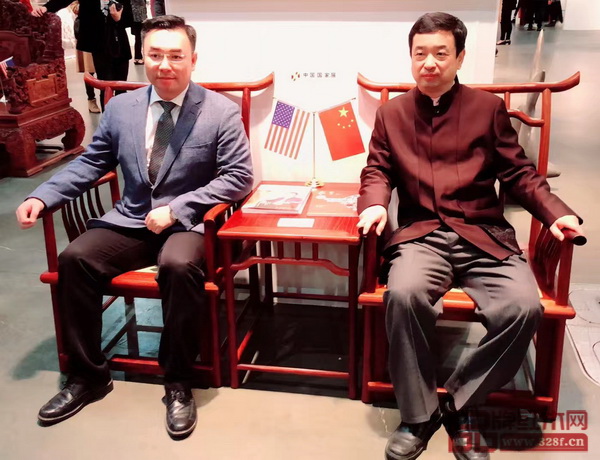 洛杉磯國際藝博會(huì)董事局主席斯科特(左)與國壽紅木副董事長陳淦凡(右)坐于《宋韻四出頭梳背椅》上合影