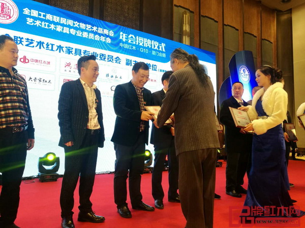 全聯(lián)藝術(shù)紅木家具專業(yè)委員會(huì)年會(huì)上,大東家(左七)被授予“副主任單位”稱號(hào)