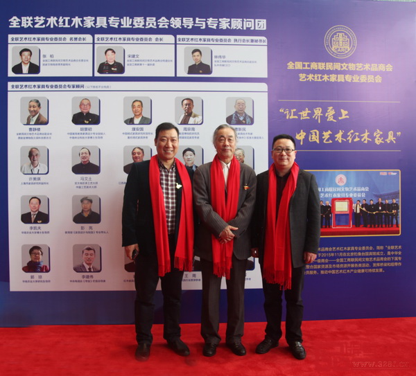 全聯(lián)藝術(shù)紅木家具專業(yè)委員會(huì)專家顧問、中國明式家具研究所原所長濮安國(中)和大東家紅木總經(jīng)理成國慶(左一)合影留念