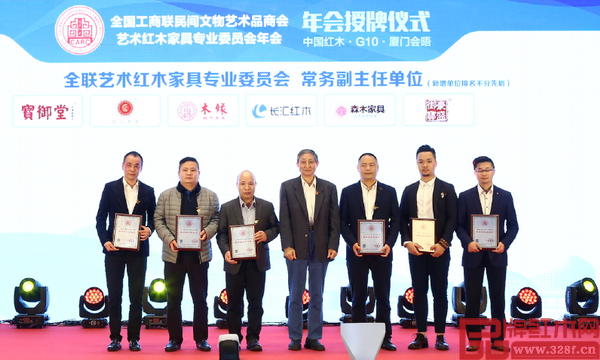 華行紅木憑借在藝術(shù)紅木家具領(lǐng)域的突出貢獻(xiàn),當(dāng)選全聯(lián)藝術(shù)紅木家具專業(yè)委員會常務(wù)副主任單位,總經(jīng)理黃岸峰(左一)上臺領(lǐng)獎