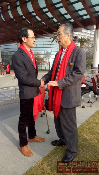 榮燊堂總經(jīng)理陳智彬(左)與全聯(lián)藝術(shù)紅木家具專業(yè)委員會(huì)專家顧問、原中國(guó)明式家具研究所所長(zhǎng)濮安國(guó)(右)在第八屆中國(guó)紅木家具品牌大會(huì)活動(dòng)現(xiàn)場(chǎng)合影留念