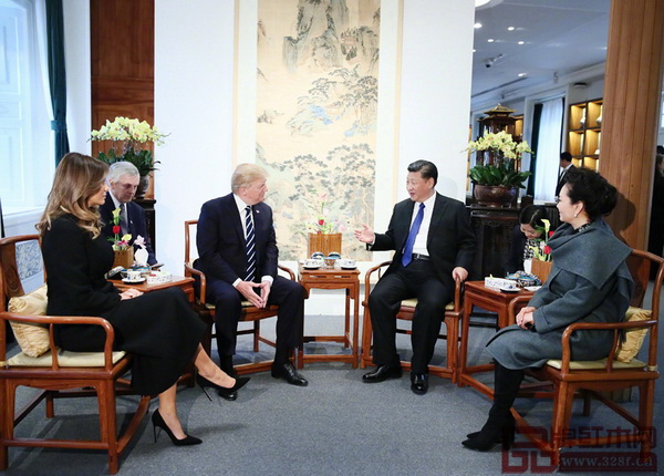 特朗普在當(dāng)選美國(guó)總統(tǒng)1周年之際來(lái)華進(jìn)行國(guó)事訪問(wèn),國(guó)家主席習(xí)近平與夫人彭麗媛選擇在故宮寶蘊(yùn)樓迎接特朗普和夫人梅拉尼婭。兩國(guó)元首夫婦互致問(wèn)候,親切寒暄,共同步入寶蘊(yùn)樓落座茶敘,四人落坐的家具是四把扇形面南官帽椅。