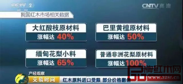 根據(jù)央視報(bào)道:由于紅木原料進(jìn)口受限,紅木價(jià)格普漲,如大紅酸枝漲幅達(dá)40%、巴里黃檀漲幅達(dá)50%、緬甸花梨漲65%,非洲花梨漲幅達(dá)100%。未來隨著紅木原材料資源日益稀缺,紅木進(jìn)口均價(jià)同比上揚(yáng),紅木家具價(jià)格將進(jìn)一步上漲。