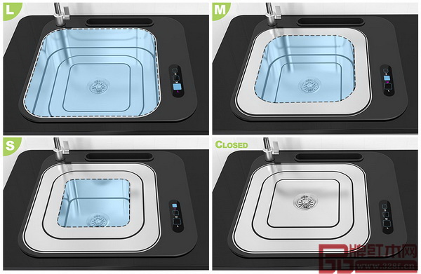 為了洗一點(diǎn)菜放一大缸水真的讓人很“煩躁”,如果能根據(jù)洗菜量來決定水槽的大小,不僅能節(jié)約用水,還能提高洗菜效率。設(shè)計(jì)師Chengyong Li等人為此設(shè)計(jì)了一個(gè)三層的嵌套式水池,使用者能根據(jù)需要調(diào)節(jié)水池底面積大小,不用時(shí)還能完全關(guān)上,這個(gè)巧妙的小設(shè)計(jì)可以說是非常環(huán)保和人性化了。