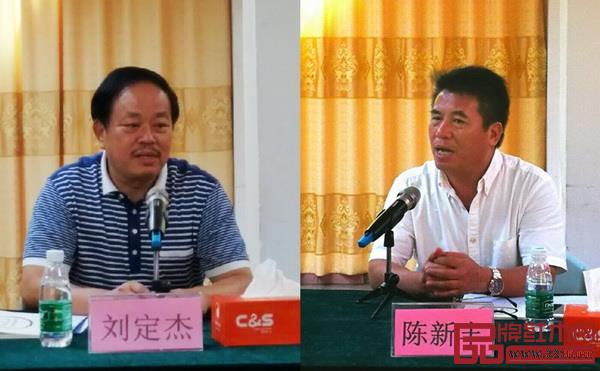 廣東四川商會(huì)紅木分會(huì)會(huì)長(zhǎng)劉定杰(左)、中山東陽(yáng)紅木商會(huì)會(huì)長(zhǎng)陳新豐(右)在會(huì)議上發(fā)言,動(dòng)員全行業(yè)共同配合擦亮中山紅木名片