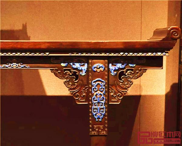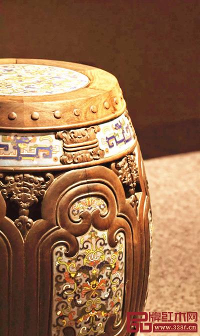 尤為引人注目的是夔龍紋翹頭案中藍(lán)色的嵌琺瑯,吉祥氣息盈滿于目,和紫檀嵌琺瑯繡墩在平直規(guī)整組合上呈現(xiàn)出的新趣味,既遵循禮制,又寓意深刻??滴鯇?duì)琺瑯極愛,特別在宮中設(shè)立“琺瑯作”,從此以后,宮廷生活中亦隨處可見琺瑯器物,雍容華貴、富麗堂皇,彰顯了清代盛期的皇家特色。但是紫檀為材質(zhì)嵌掐絲琺瑯者屬于清宮家具的精品,材美工巧,屬于帝王之家垂青的家具品種,民間少見,這也是殊為難得。