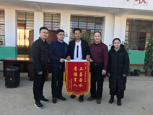 云南紅河縣期垤小學(xué)校長李孟付贈予東成文宋愛心公益團“上善若水,厚德育人”的榮譽錦旗