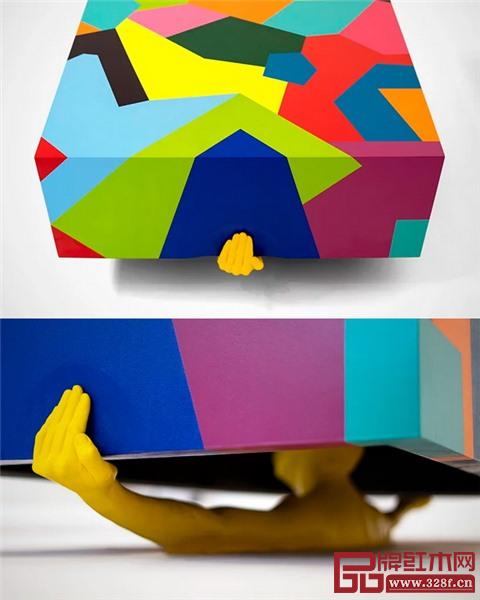 標(biāo)題乍看上去可能有些嚇人。其實這款設(shè)計咖啡桌在外觀設(shè)計上是非常有趣吸引人的。由荷蘭設(shè)計工作室V&Ko設(shè)計的這款咖啡桌在用色上非常的大膽前衛(wèi),色彩搭配炫彩奪目,另外用一個金色的小巨人做成底座支架,小巨人用一雙有力的臂膀把桌子穩(wěn)穩(wěn)抬起,整張桌子看上去非常的有趣而且非常有藝術(shù)品味。