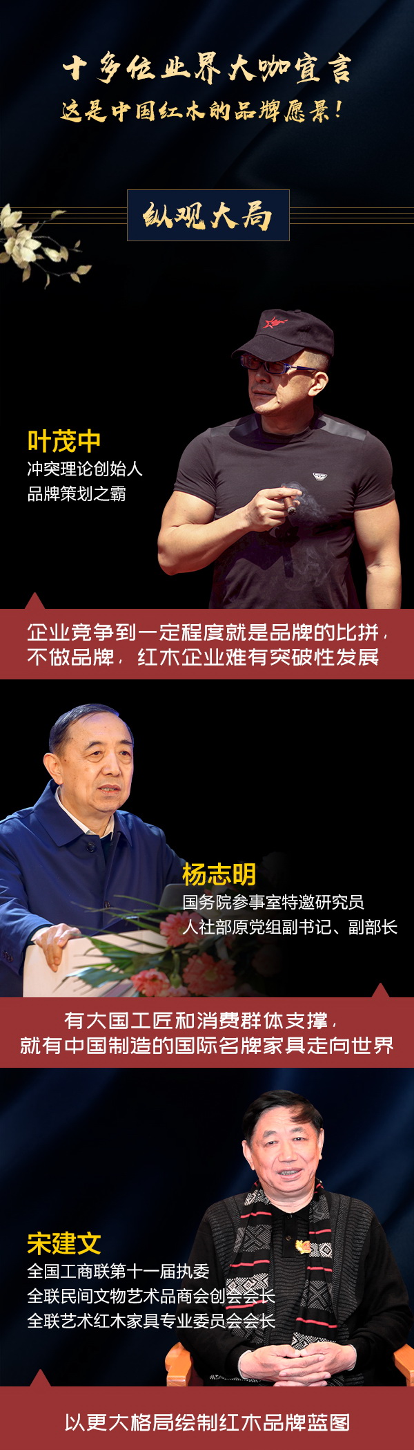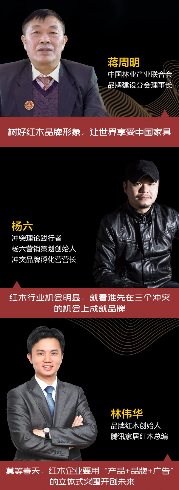 不僅有中國品牌營銷策劃的教父級人物,沖突創(chuàng)始人、品牌策劃之霸葉茂中,沖突理論踐行者、楊六營銷策劃創(chuàng)始人、沖突品牌孵化營營長楊六做客《大咖之聲》訪談節(jié)目,還邀請到十多位業(yè)界大咖,共同描繪中國紅木的品牌愿景。