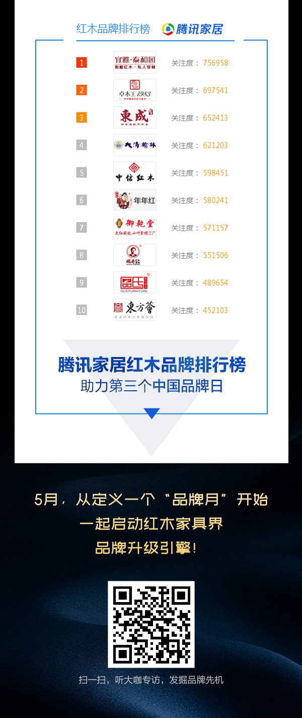 在第三個中國品牌日,品牌紅木聯(lián)合騰訊家居紅木頻道推出了“中國紅木品牌日”,向行業(yè)輸送品牌之機,闡釋品牌之變、講述品牌之道,讓紅木品牌更好地成為中國對話世界的語言。