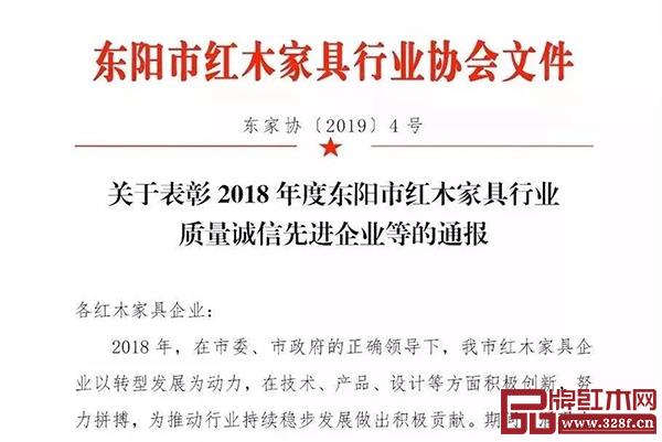 2018年,在東陽市委、市政府的正確領(lǐng)導下,東陽市紅木家具企業(yè)以轉(zhuǎn)型發(fā)展為動力,在技術(shù)、產(chǎn)品、設計等方面積極創(chuàng)新,努力拼搏,涌現(xiàn)出一批發(fā)展勢頭良好、勇于開拓的先進企業(yè)。為了表彰先進,充分發(fā)揮模范帶頭作用,經(jīng)綜合審定,國祥紅木家具有限公司(以下簡稱國祥紅木)被評為“2018年度東陽市紅木家具行業(yè)質(zhì)量誠信先進企業(yè)”。