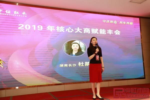 中信紅木2018年度品牌忠誠獎獲得者杜鵑進行分享,她表示:做生意沒有服務,只有做人,把人做好了,生意自然就好了。同時,她從店面形象、文化以及渠道異業(yè)聯(lián)盟等方面進行了分享,獲得陣陣掌聲。