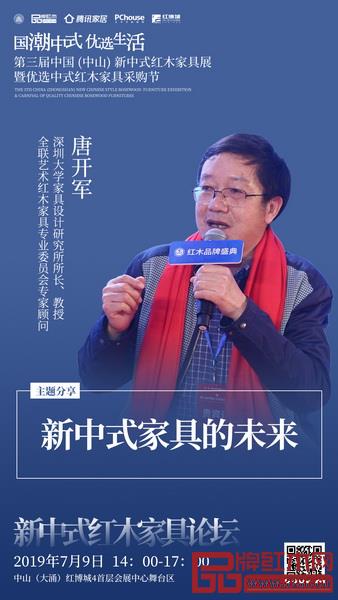 7月9日,在第三屆中國新中式紅木家具論壇上,全聯(lián)藝術(shù)紅木家具專業(yè)委員會專家顧問、深圳大學(xué)家具設(shè)計研究所所長唐開軍將以“新中式家具的未來”為主題,指明新中式家具時代化的發(fā)展路徑。
