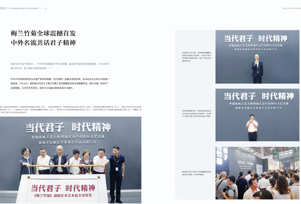《泰和》“當(dāng)代君子”章節(jié),重現(xiàn)了《梅蘭竹菊》全球首發(fā)的歷史時(shí)刻,重溫了名家話當(dāng)代君子的精彩語錄,讓業(yè)界這一大事件刻進(jìn)當(dāng)代中國紅木家具的歷史新篇章。