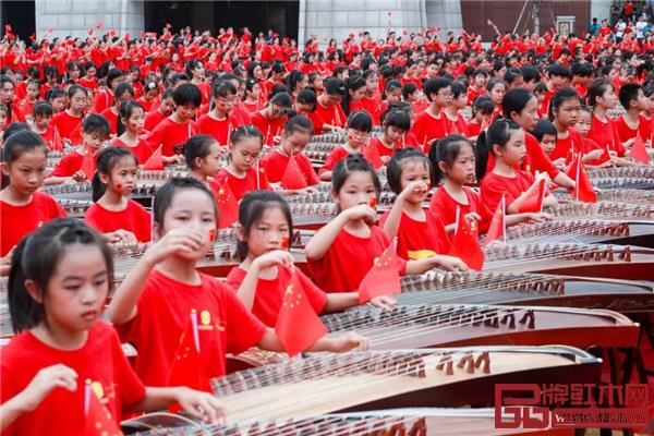 10月13日上午,在中山(大涌)紅木文化博覽城上演了一場(chǎng)“慶祝中華人民共和國(guó)成立70周年”千箏齊奏《我的祖國(guó)》大型古箏展演活動(dòng)。由1200臺(tái)古箏在紅博城廣場(chǎng)同時(shí)奏響主題鮮明、氣勢(shì)磅礴的《我的祖國(guó)》《大中國(guó)》等曲目。