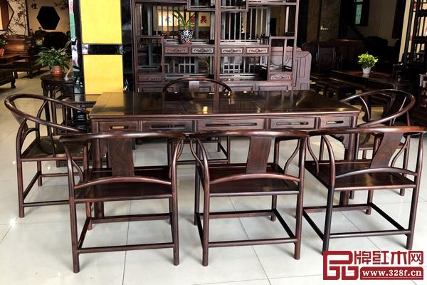 選用印尼黑酸枝打造,茶臺將海棠花造型融入茶桌,配上圓弧搭腦的茶桌,以及六邊形的茶凳,整個造型多樣,曲直有度,比例合適,再加上大膽的紅色點綴,時尚經典,符合大當代家居風格。