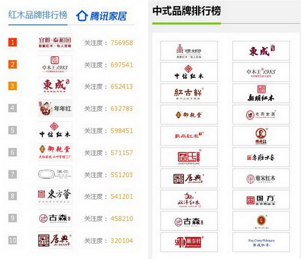 騰訊家居紅木頻道品牌排行榜(左)、太平洋家居中式家具頻道品牌排行榜(右)