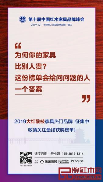 12月26日,讓我們相約世界軍人運動會舉辦地—武漢,一起在2019紅木家具“紅品獎”品牌盛典上,見證2019大紅酸枝家具熱門品牌得主花落誰家。