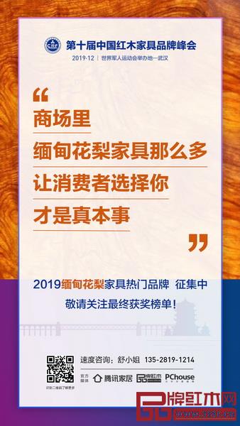 大眾想要挑選緬甸花梨家具品牌,可關(guān)注今年12月舉行的第十屆中國紅木家具品牌峰會——2019紅木家具“紅品獎”品牌盛典,屆時“2019緬甸花梨家具熱門品牌”將于盛典上揭曉。該評選至今已連續(xù)舉辦到第10年,是全國工商聯(lián)直屬商會——全聯(lián)民間文物藝術(shù)品商會及其下屬專業(yè)委員會——全聯(lián)民間文物藝術(shù)品商會藝術(shù)紅木家具專業(yè)委員會主辦的公開專業(yè)評選,大眾主流平臺騰訊家居、太平洋家居和行業(yè)專業(yè)門戶品牌紅木聯(lián)合推薦。