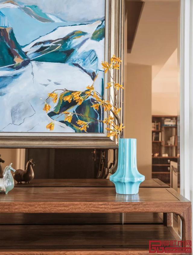 ▲從色彩上來說,搭配也相當(dāng)溫馨和諧。淺米色的背景相當(dāng)于給刺猬紫檀打了個底色,淺米色+棕色看起來就很和諧溫馨,再配上少量的藍(lán)色系軟裝,一冷一暖,對比強(qiáng)烈而鮮明,令人眼前一亮。