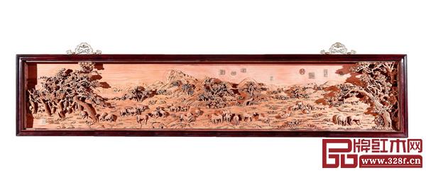 大師出品,必定不凡。鴻庭軒陳戴青大師的木雕力作《百駿圖》掛屏,選材緬甸花梨,手工雕刻完成。該作品共刻有駿馬百匹,姿勢(shì)各異,或立或臥,或奔或跑,或跪或戲,可謂曲盡駿馬之態(tài)。畫面的首尾各有牧者數(shù)人,控制著整個(gè)馬群,體現(xiàn)了一種人與自然的和諧。壩上風(fēng)光,木蘭圍場(chǎng);崇山峻嶺,古木參天;百駿百態(tài),撲面而來;形態(tài)逼真,栩栩如生;精致細(xì)膩,巧奪天工;氣勢(shì)磅礴,酣暢淋漓;起伏跌宕,一氣呵成;鬼斧神工,攝人魂魄。