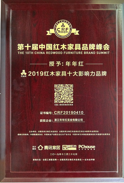 年年紅斬獲“紅木家具十大影響力品牌”