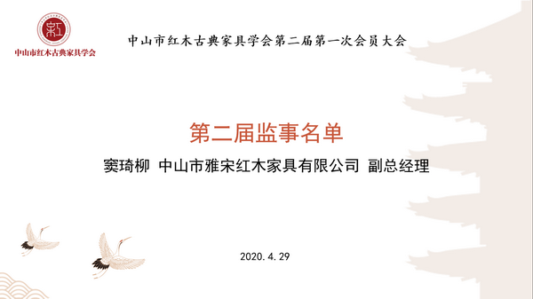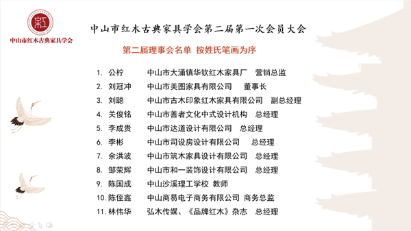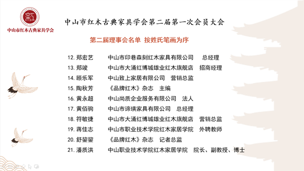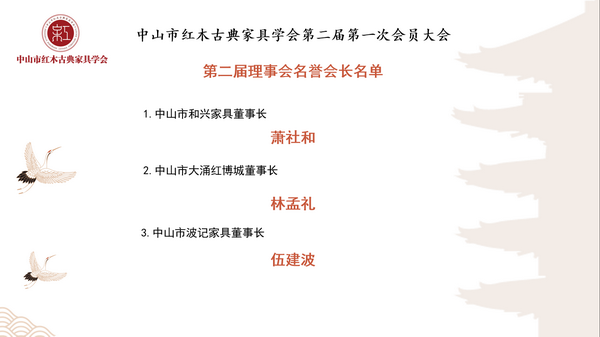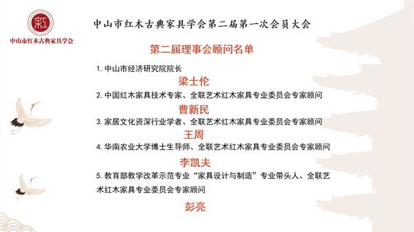 中山市紅木古典家具學會第二屆第一次會員大會宣布理事會顧問和榮譽會長名單