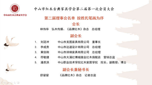 在隨后召開的學會第二屆第一次理事會議中,弘木傳媒創(chuàng)始人、CEO林偉華當選為學會會長。美圖家具董事長劉冠沖,達道設計總經(jīng)理李成貴,諦璜家具總經(jīng)理黃佰駒,雄業(yè)紅木營銷總監(jiān)符敏捷,中山職業(yè)技術學院紅木家居學院院長、副教授、博士潘質(zhì)洪當選為學會副會長。《品牌紅木》雜志記者總監(jiān)舒鋆鋆當選為學會副會長兼秘書長。