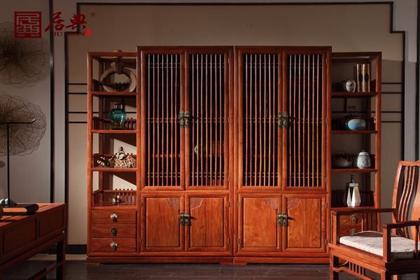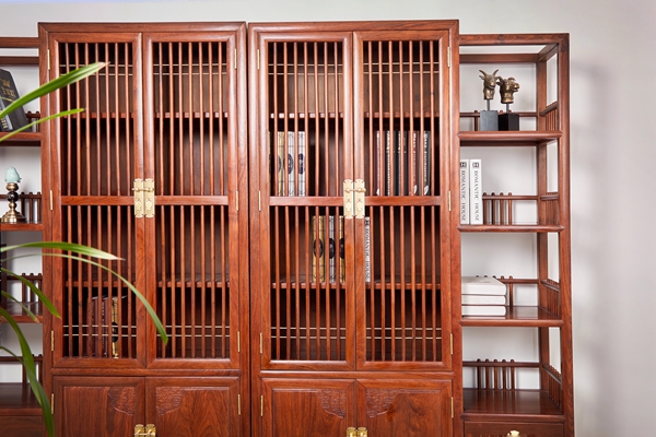 居典紅木《悅幾書柜》以梳子式設(shè)計(jì)為主,豎直的線條連接成面,大大增強(qiáng)空間的平衡感和縱深感,整個(gè)書柜顯得寬廣高闊,為您的書房創(chuàng)造妙不可言的精致度。