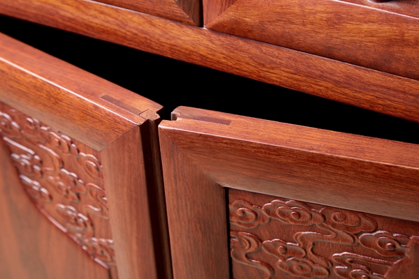 目光移至《悅幾書柜》底部,底部柜門上刻著中式傳統(tǒng)元素——祥云,“祥云所指,福氣所至”。這一明式簡約祥云雕刻立體生動(dòng)卻不浮夸,不僅代表著吉祥高升的美好祝愿,更是中國傳統(tǒng)文化的體現(xiàn)與傳承。