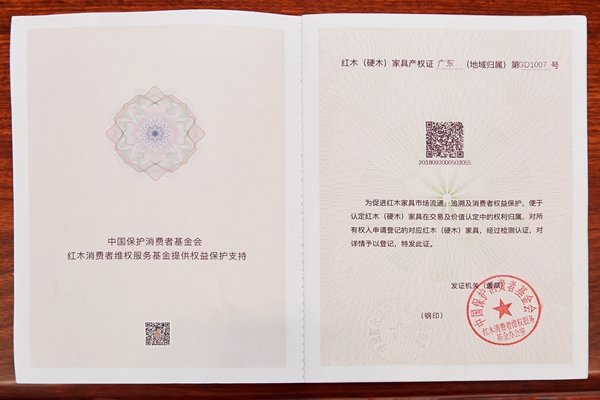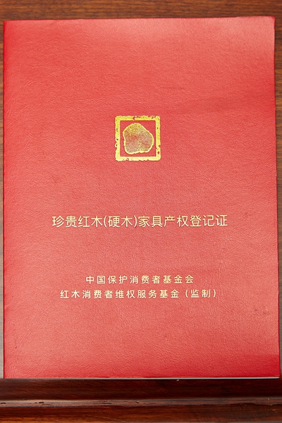 居典紅木《悅幾書房》系列擁有屬于自己的“產(chǎn)權(quán)證”。這本“產(chǎn)權(quán)證”全名為《珍貴紅木(硬木)家具產(chǎn)權(quán)登記證》,由中國保護(hù)消費(fèi)者基金會(huì)紅木消費(fèi)者維權(quán)服務(wù)基金監(jiān)制,權(quán)威的材質(zhì)工程保障所購買的紅木家具真實(shí)可靠。